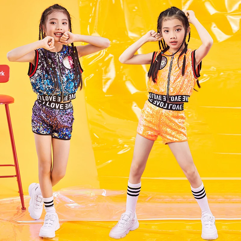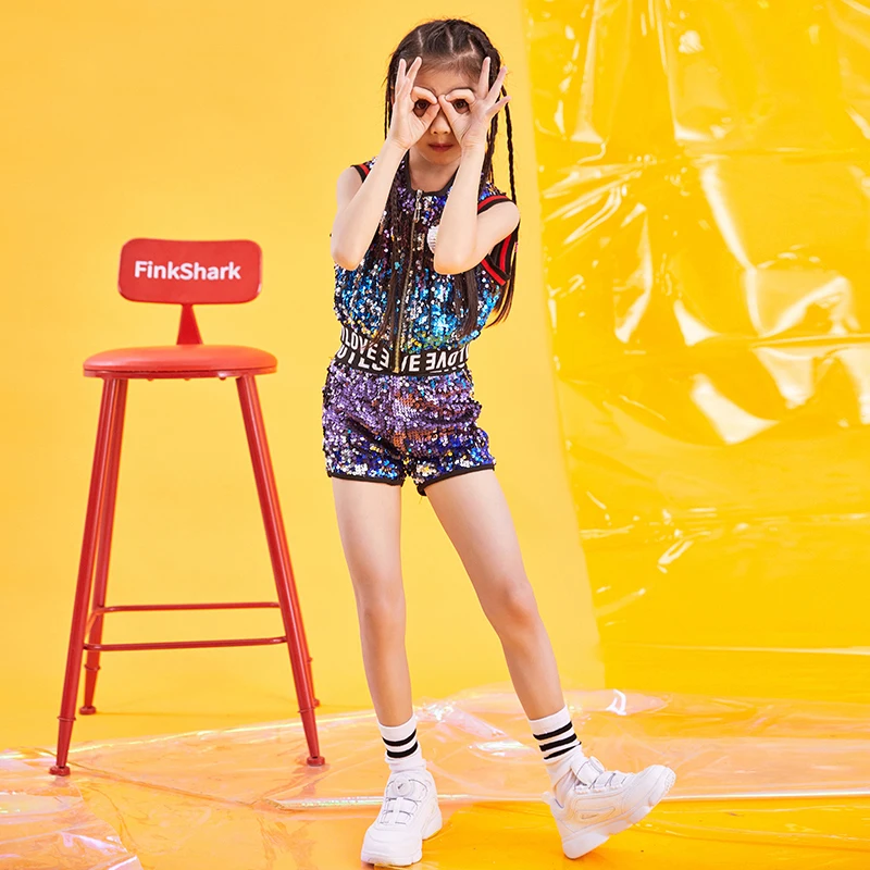 BEST Jazz Costume Kids Sequined Vest Jacket Shorts Street Dance Clothing Cheerleader Outfits Girls Hip H
